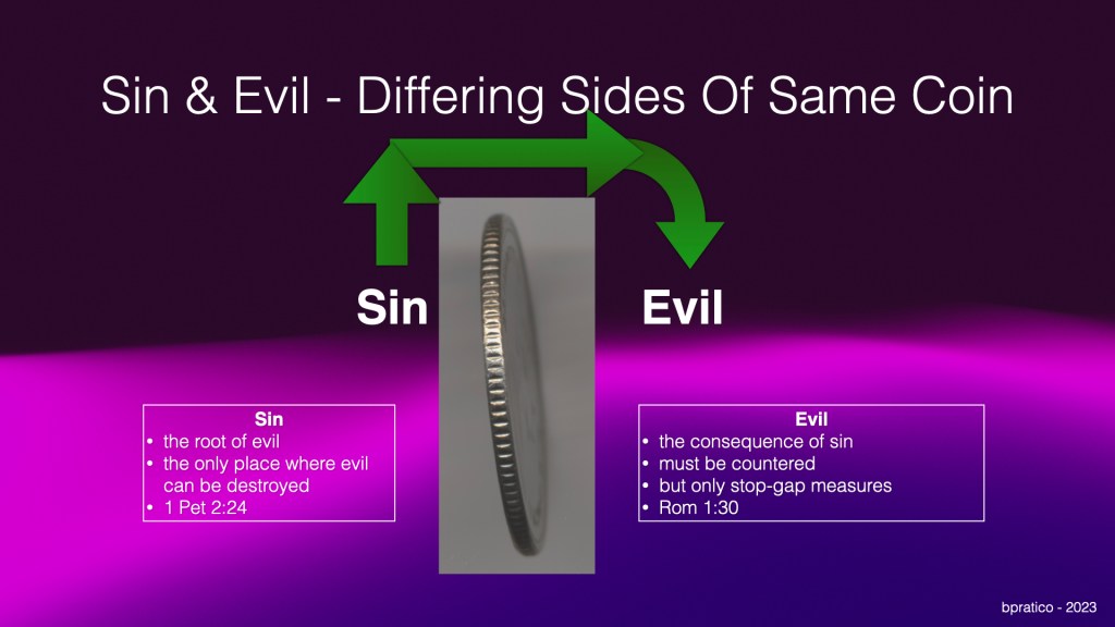Evil is the consequence of sin (Rom 1:30 – “they invent ways of doing evil.) While evil must always be countered, we need to recognize that is always only a stop-gap measure at best, akin to pulling up the top half of a weed but leeaving the root for it to grow back. Combatting evil in this fallen world is never-ending. The mistake that some Christians make is thinking that we gain the victory by countering evil.