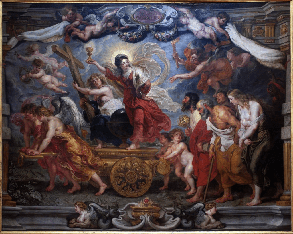 Earlier I posted here on the harmonious relationship between faith and reason. J.P. Moreland comments on their relationship in his book Scientism and Secularism, writing “In his seventeenth-century work of art titled The Triumph of Faith over Nature, Philosophy, and Science, Peter Paul Rubens attempted to capture a widely held view of faith and reason. In his painting, Rubens depicted religion as a person seated in a triumphal chair on a cart pulled by angels. Walking beside and near the back of the cart are different figures. Among those figures are a young man and an old man representing, respectively, science and philosophy. The painting conveys the notion of an integrated worldview where faith and reason are in harmony, theology is the queen of the sciences, and the discipline of philosophy is the wise, old, long-standing friend of theology.” The painting Moreland is referring to is below.