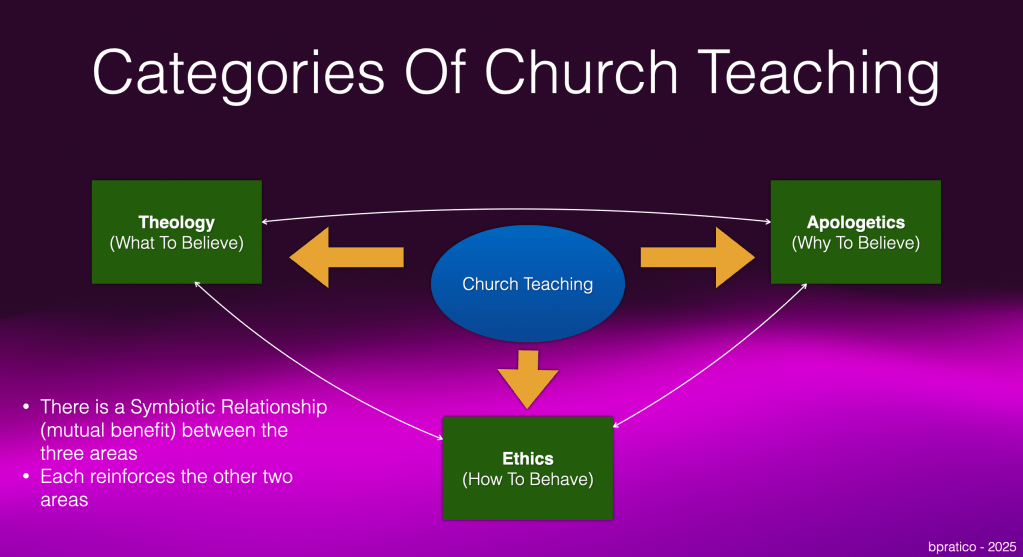 Church teaching has been historically divided into three categories: (1) THEOLOGY (what to believe), (2) APOLOGETICS (why to believe) and (3) ETHICS (how to act). There is a Symbiotic Relationship (mutual benefit) between the three areas, with each reinforcing the other two areas. If we emphasize one area to the exclusion of the other areas, we diminish the effectiveness of church teaching.