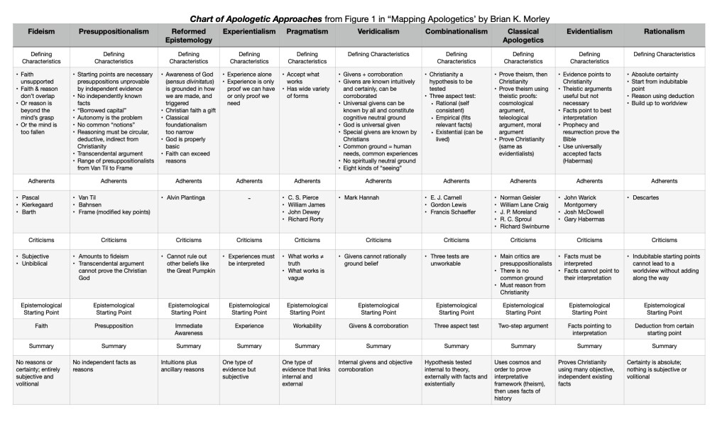+ classical, Combinationalism, Evidentialism, Experientialism, Fideism, Pragmatism, Presuppositionalism, Rationalism, Reformed, Veridicalism